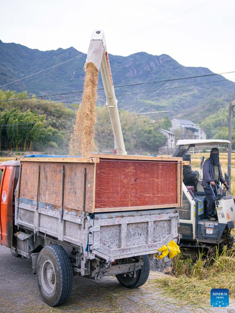 A farmer loads newly harvested paddy rice into a motor tricycle at Sandu Town in Jiande, east China's Zhejiang Province, on Oct. 26, 2022. (Xinhua/Jiang Han)
