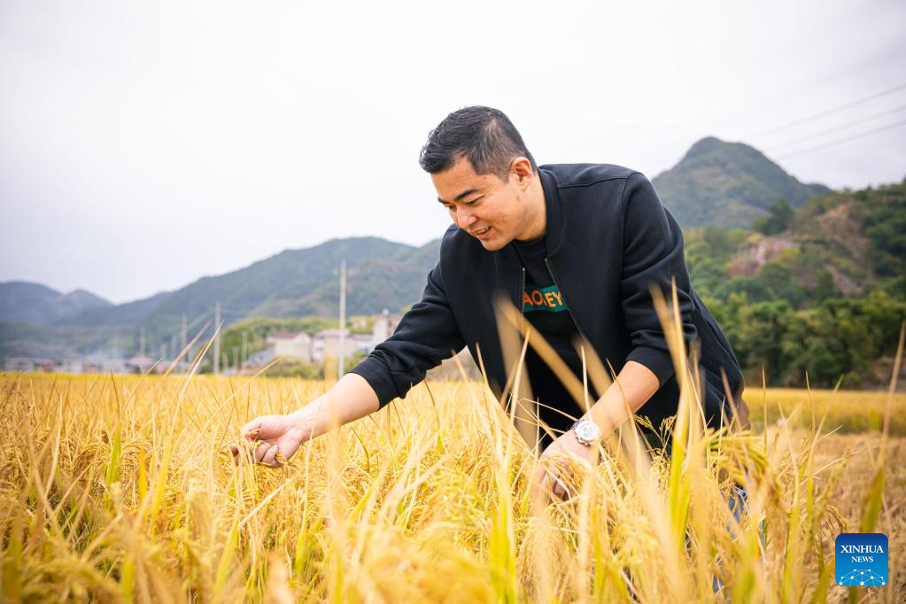 A farmer checks the maturity of paddy rice in his fields at Sandu Town in Jiande, east China's Zhejiang Province, Oct. 26, 2022. (Xinhua/Jiang Han)