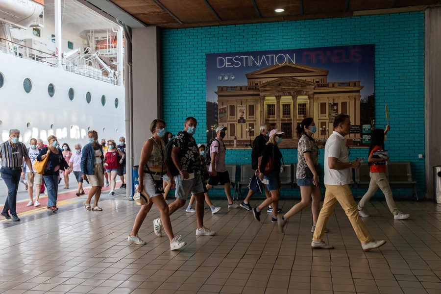 Passengers of a cruise ship disembark at Piraeus port in Piraeus, Greece, June 2, 2022. (Xinhua/Marios Lolos)