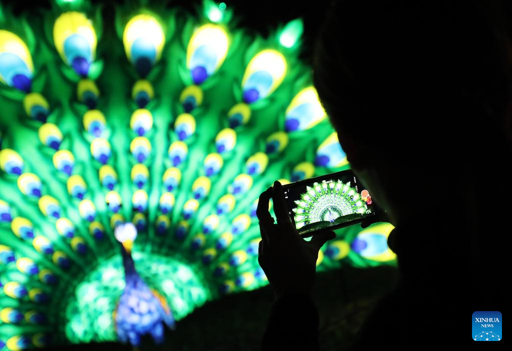 A visitor views illuminated sculptures during a media tour of a light festival at Thoiry zoo near Paris, France, Oct. 26, 2022. The festival will kick off here on Sunday, displaying around 2,000 illuminated sculptures. (Xinhua/Gao Jing)