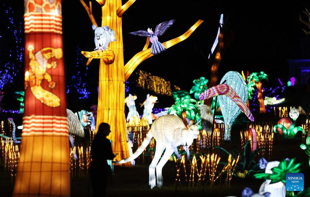 Illuminated sculptures are pictured during a media tour of a light festival at Thoiry zoo near Paris, France, Oct. 26, 2022. The festival will kick off here on Sunday, displaying around 2,000 illuminated sculptures. (Xinhua/Gao Jing)