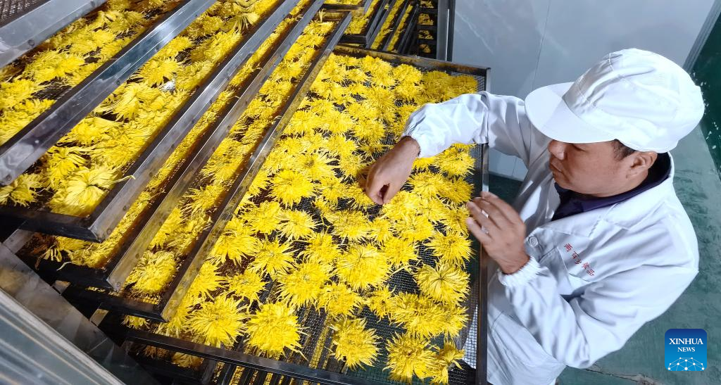 A staff member checks the condition of dried chrysanthemums in Yuelin Village of Nanyue District, Hengyang City, central China's Hunan Province, Oct. 27, 2022. Chrysanthemums, which can be processed into chrysanthemum tea, have entered the harvest season here. (Xinhua/Zhao Zhongzhi)