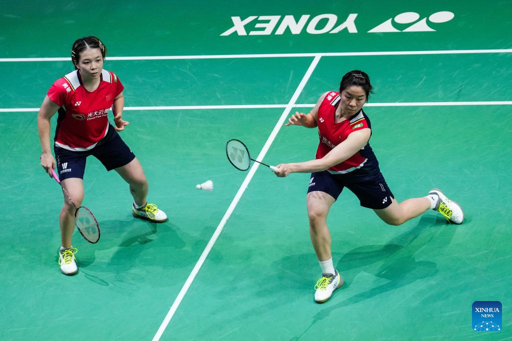 Chen Qingchen (L)/Jia Yifan compete during the women's doubles round of 16 match between Chen Qingchen/Jia Yifan of China and Supissara Paewsampran/Puttita Supajirakul of Thailand at the French Open 2022 badminton tournament in Paris, France, Oct. 27, 2022. (Photo by Tang Shi/Xinhua)
