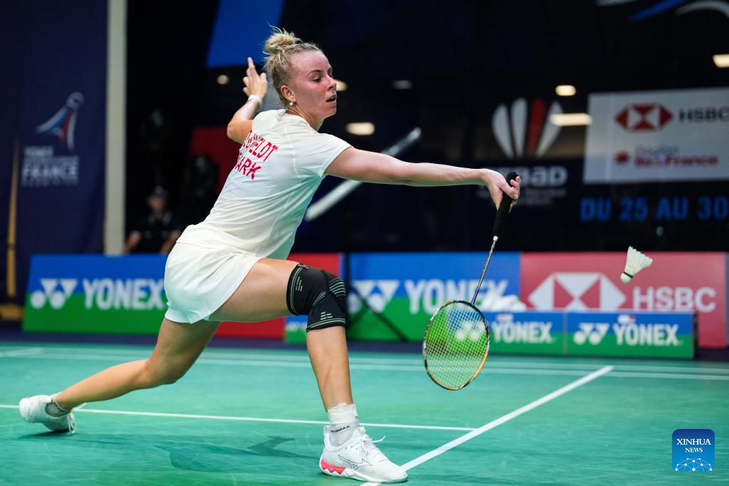 Mia Blichfeldt of Denmark hits a return during the women's singles round of 16 match against He Bingjiao of China at the French Open 2022 badminton tournament in Paris, France, Oct. 27, 2022. (Photo by Tang Shi/Xinhua)