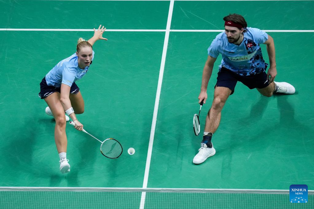 Mathias Christiansen (R)/Alexandra Boje compete during the mixed doubles round of 16 match between Zheng Siwei/Huang Yaqiong of China and Mathias Christiansen/Alexandra Boje of Denmark at the French Open 2022 badminton tournament in Paris, France, Oct. 27, 2022. (Photo by Tang Shi/Xinhua)