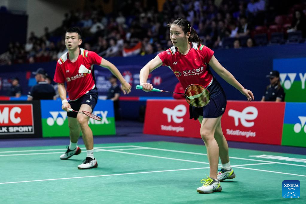 Zheng Siwei (R)/Huang Yaqiong compete during the mixed doubles round of 16 match between Zheng Siwei/Huang Yaqiong of China and Mathias Christiansen/Alexandra Boje of Denmark at the French Open 2022 badminton tournament in Paris, France, Oct. 27, 2022. (Photo by Tang Shi/Xinhua)