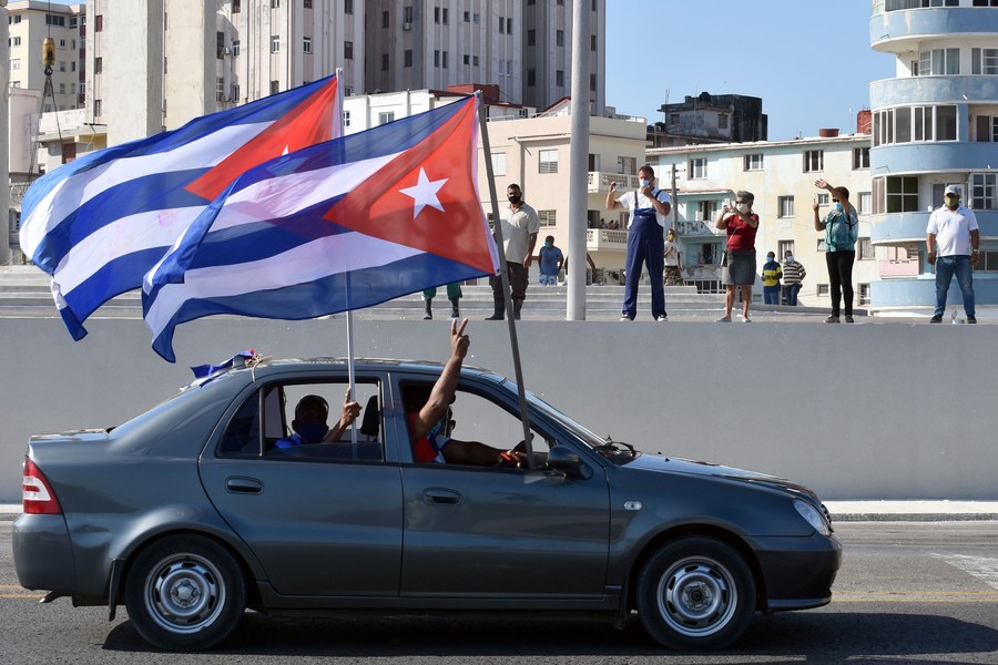 People take part in a caravan in Havana, Cuba, on March 28, 2021. (Xinhua/Zhu Wanjun)