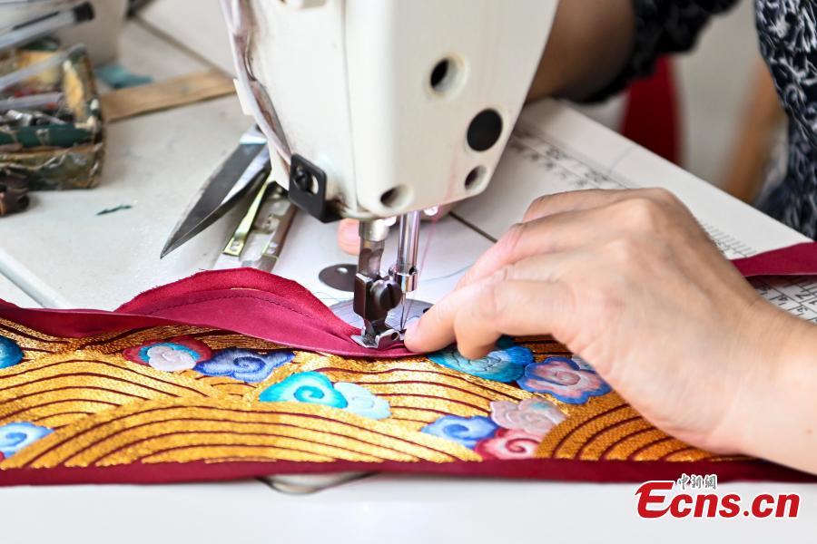 Tailor Wong works on a Longfeng Gua at her studio in Shunde, south China's Guangdong Province. (Photo: China News Service/Chen Jimin)