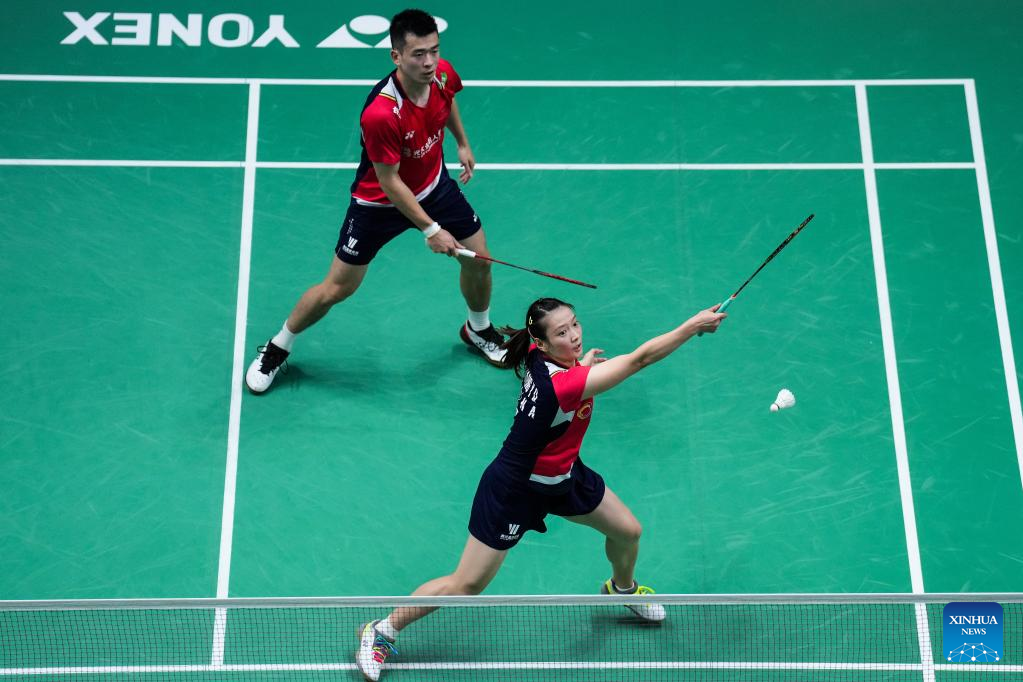 Zheng Siwei(L)/Huang Yaqiong compete during the mixed doubles quarterfinal match between Zheng Siwei/Huang Yaqiong of China and Kaneko Yuki/Matsutomo Misaki of Japan at the French Open 2022 badminton tournament in Paris, France, Oct. 28, 2022. (Photo by Tang Shi/Xinhua)