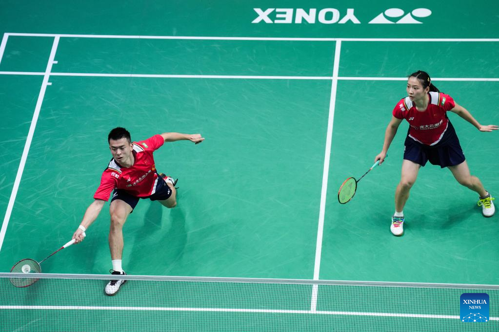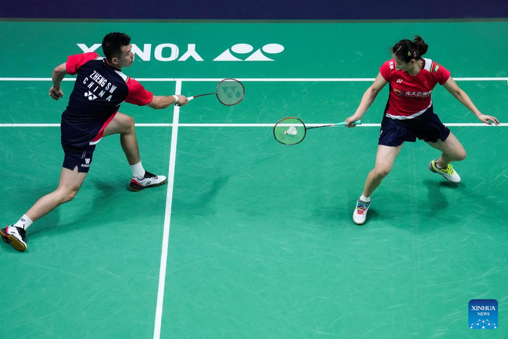 Zheng Siwei(top)/Huang Yaqiong compete during the mixed doubles quarterfinal match between Zheng Siwei/Huang Yaqiong of China and Kaneko Yuki/Matsutomo Misaki of Japan at the French Open 2022 badminton tournament in Paris, France, Oct. 28, 2022. (Photo by Tang Shi/Xinhua)