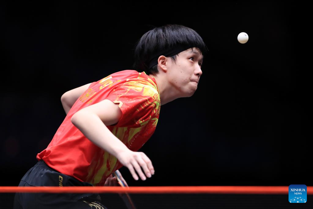 Fan Zhendong of China hits a return during the men's singles quarterfinal match against Dimitrij Ovtcharov of Germany at the WTT Cup Finals in Xinxiang, central China's Henan Province, Oct. 28, 2022. (Photo by Gao Zhiyong/Xinhua)