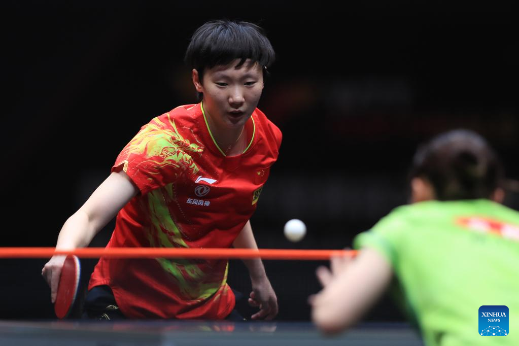Chen Xingtong of China returns the ball during the women's singles quarterfinal match against her teammate Chen Meng at the WTT Cup Finals in Xinxiang, central China's Henan Province, Oct. 28, 2022. (Photo by Gao Zhiyong/Xinhua)