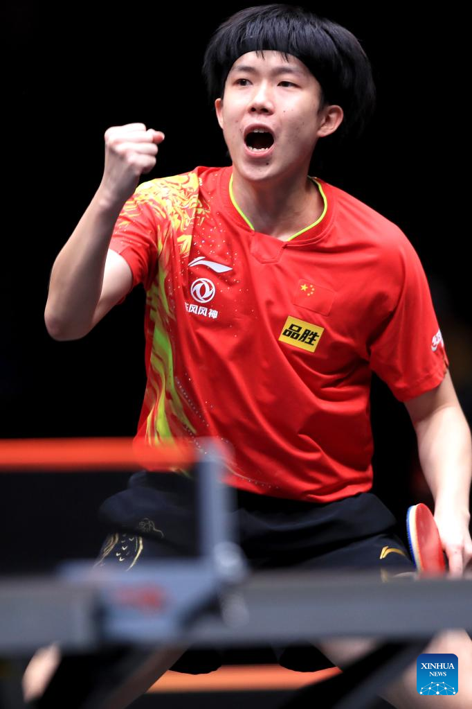 Wang Chuqin of China celebrates scoring during the men's singles quarterfinal match against Truls Moregard of Sweden at the WTT Cup Finals in Xinxiang, central China's Henan Province, Oct. 28, 2022. (Photo by Gao Zhiyong/Xinhua)