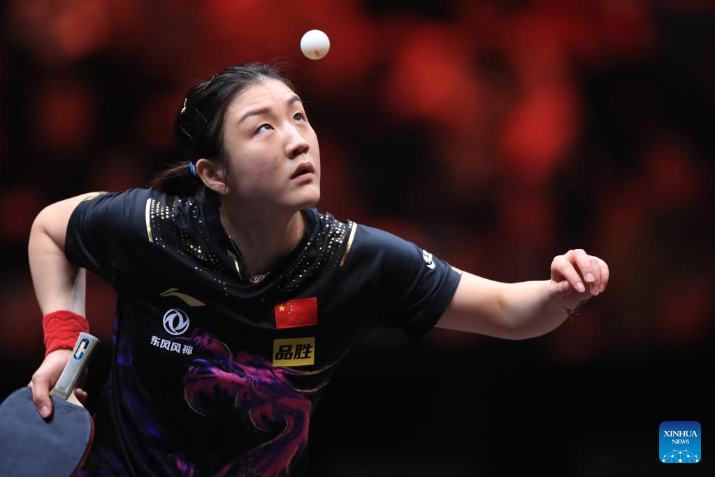 Chen Meng of China returns the ball during the women's singles quarterfinal match against her teammate Chen Xingtong at the WTT Cup Finals in Xinxiang, central China's Henan Province, Oct. 28, 2022. (Photo by Gao Zhiyong/Xinhua)