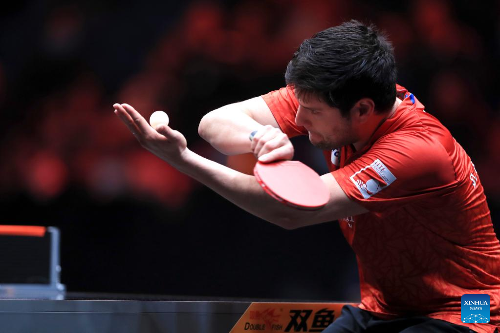 Dimitrij Ovtcharov of Germany serves during the men's singles quarterfinal match against Fan Zhendong of China at the WTT Cup Finals in Xinxiang, central China's Henan Province, Oct. 28, 2022. (Photo by Gao Zhiyong/Xinhua)