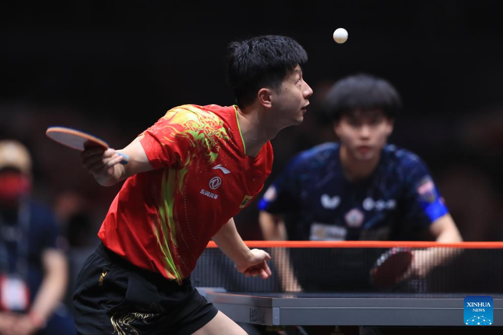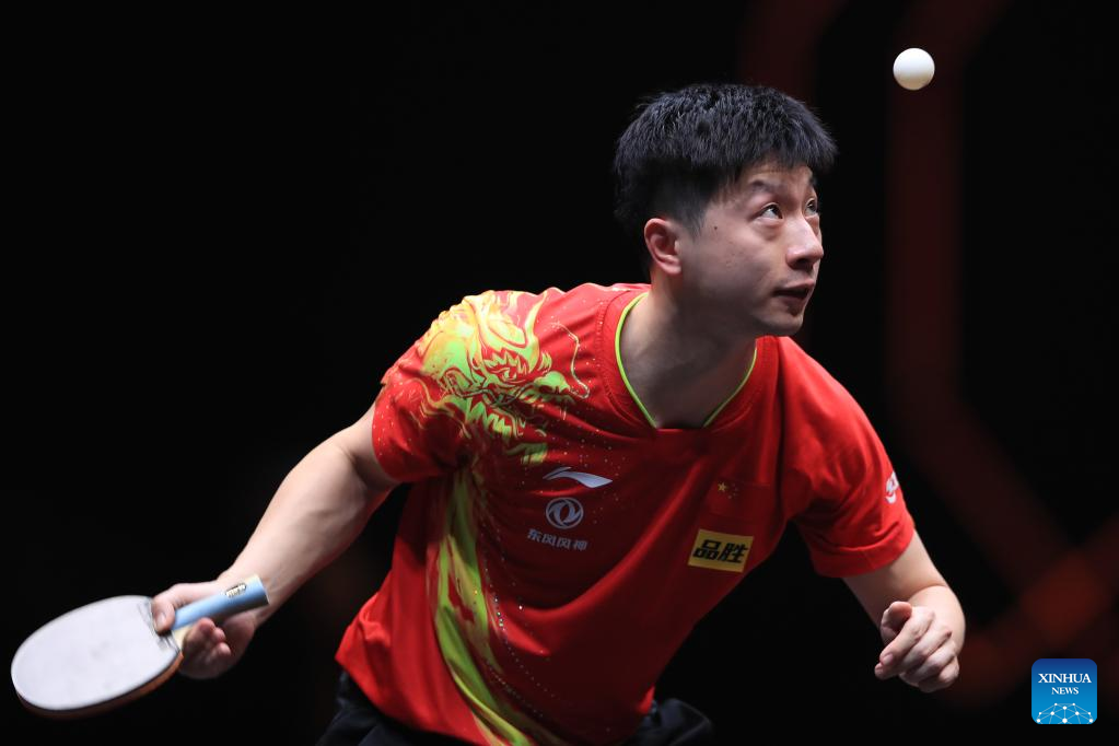Ma Long of China serves during the men's singles quarterfinal match against Lin Yun-Ju of Chinese Taipei at the WTT Cup Finals in Xinxiang, central China's Henan Province, Oct. 28, 2022. (Photo by Gao Zhiyong/Xinhua)