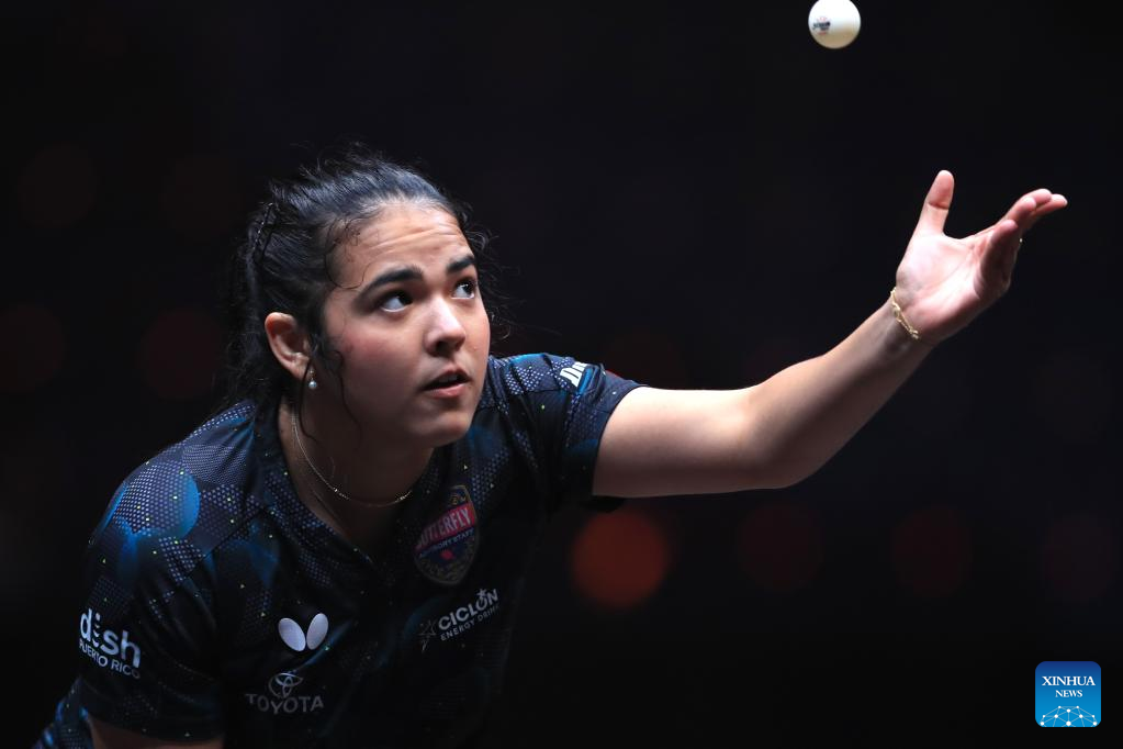 Adriana Diaz of Puerto Rico serves during the women's singles quarterfinal match against Wang Yidi of China at the WTT Cup Finals in Xinxiang, central China's Henan Province, Oct. 28, 2022. (Photo by Gao Zhiyong/Xinhua)