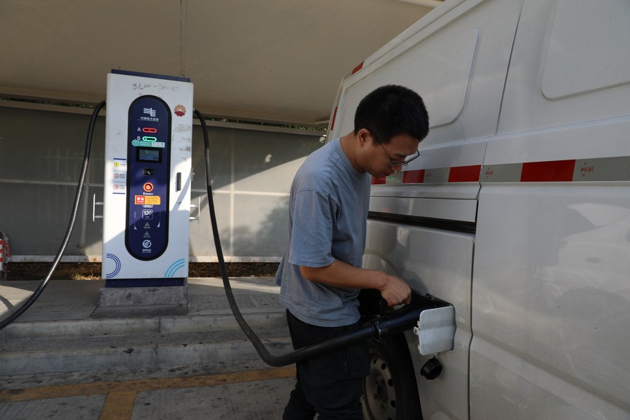 A man charges his new energy vehicle at a service area along the Guangzhou-Shenzhen expressway in south China's Guangdong Province, Oct. 27, 2022. (Xinhua/Li Jiale)