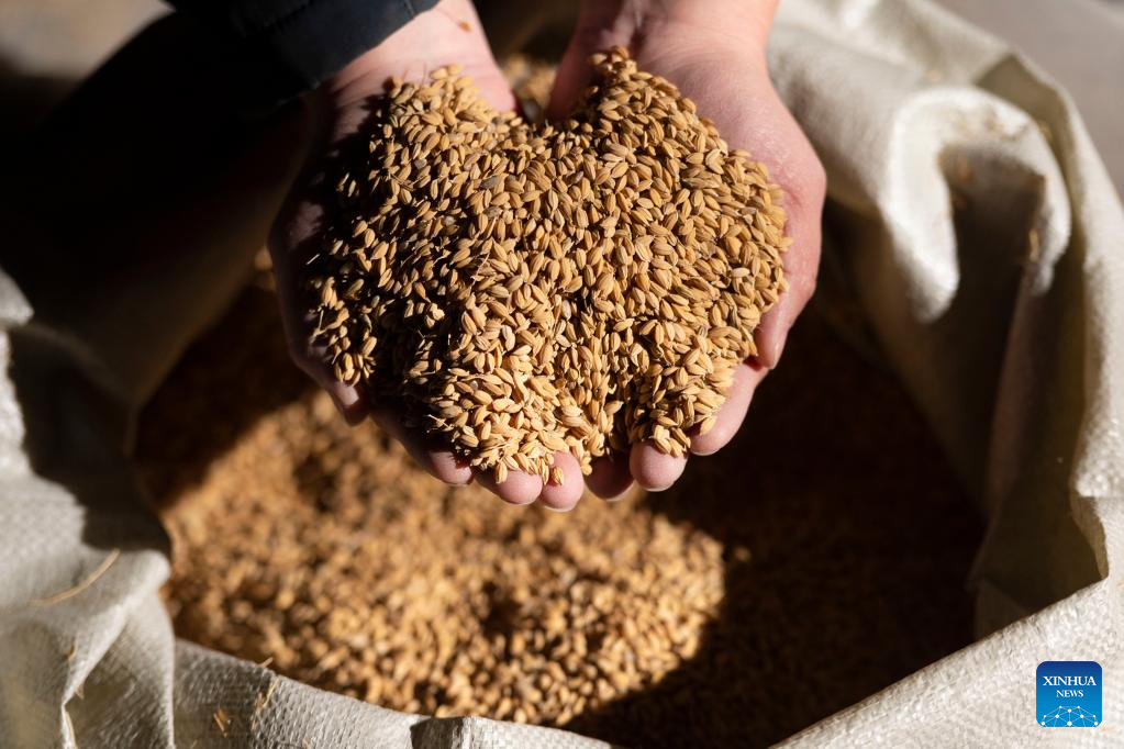 A worker checks newly purchased rice at a company of China Grain Reserves Group (Sinograin) in Harbin, northeast China's Heilongjiang Province, Oct. 28, 2022. Autumn grain purchasing work is underway in Heilongjiang. (Xinhua/Xie Jianfei)