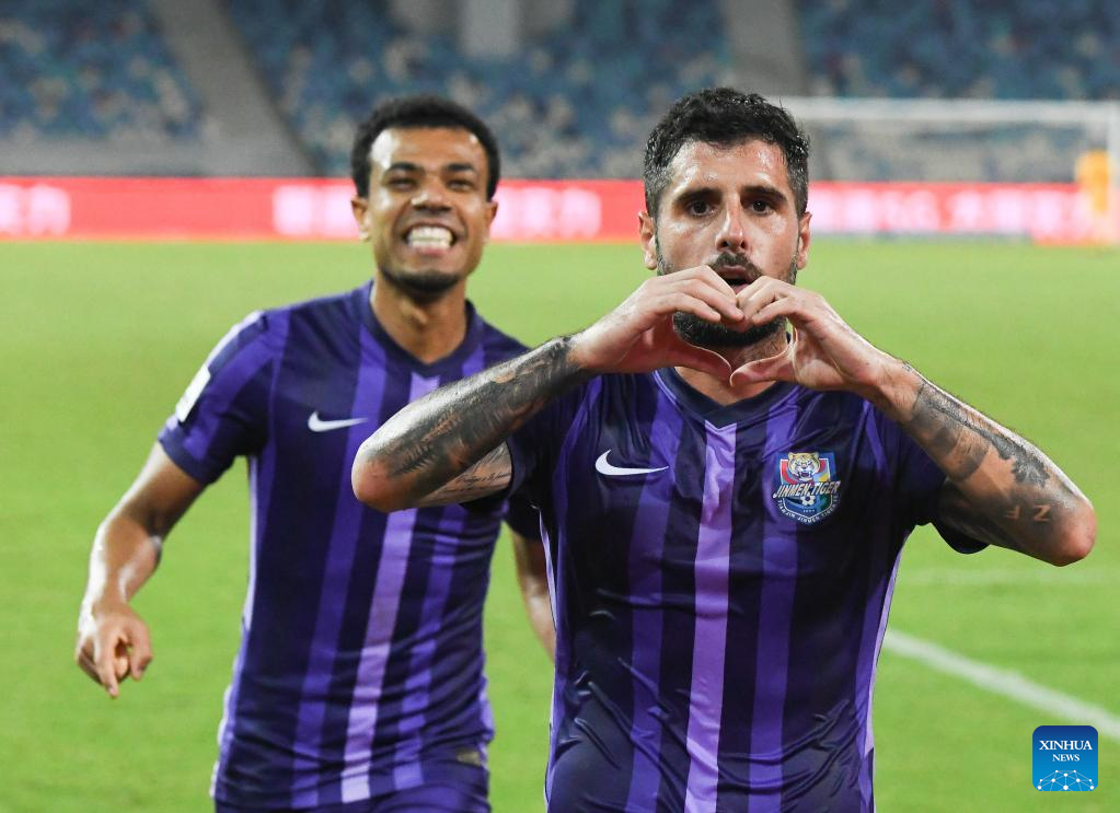 Fran Merida (R) of Tianjin Jinmen Tigers celebrates his goal during a 2022 season Chinese Football Association Super League (CSL) match against Zhejiang FC in Haikou, south China's Hainan Province, Oct. 29, 2022. (Xinhua/Yang Guanyu)