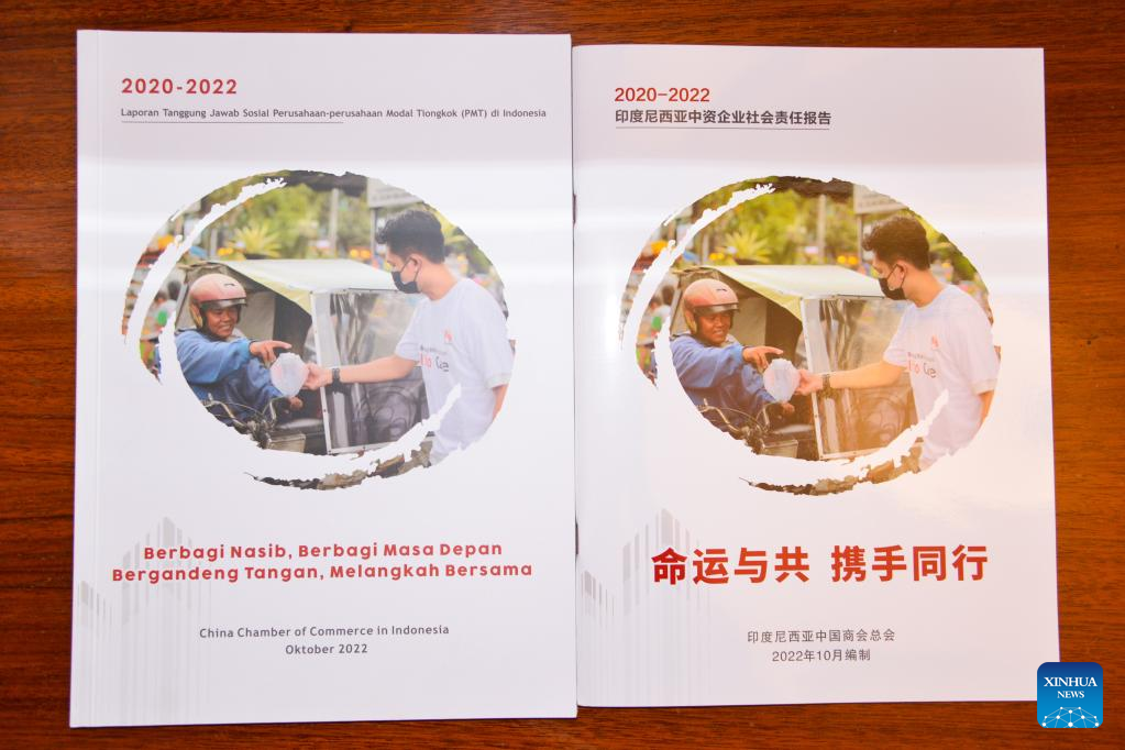 This photo taken on Oct. 30, 2022 shows the covers of the Indonesian (L) and Chinese versions of "The Report on Chinese Companies' Social Responsibility in Indonesia 2020-2022" released in Jakarta, Indonesia. Chinese companies in Indonesia have contributed to Indonesia's economic and social development, the China Chamber of Commerce in Indonesia said in a report on Friday.(Xinhua/Xu Qin)