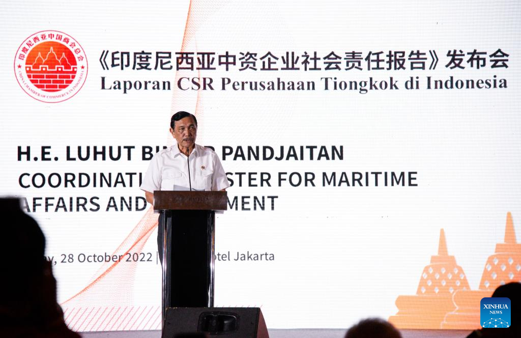 Indonesia's Coordinating Minister for Maritime Affairs and Investment Luhut Binsar Pandjaitan speaks at the release ceremony of "The Report on Chinese Companies' Social Responsibility in Indonesia 2020-2022" on Oct. 28, 2022 in Jakarta, Indonesia. Chinese companies in Indonesia have contributed to Indonesia's economic and social development, the China Chamber of Commerce in Indonesia said in a report on Friday.(Xinhua/Xu Qin)