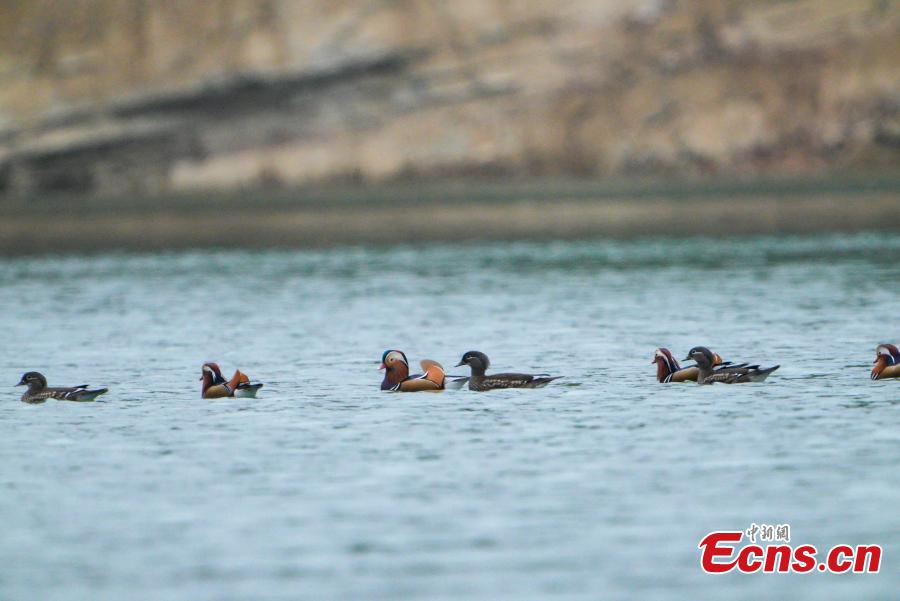 A flock of Mandarin ducks swim in the Diluo lake in Jiangkou County of Tongren City, southwest China's Guizhou Province. Migrant Mandarin ducks enjoy winter in Guizhou. (Photo: China News Service/Li He)