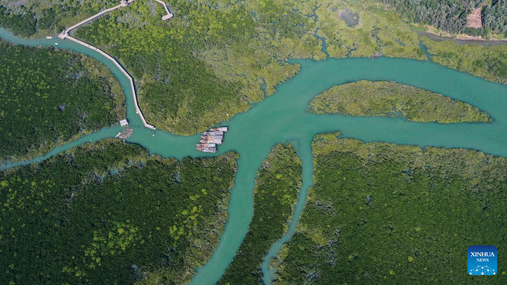 This aerial photo taken on Oct. 22, 2022 shows the scenery of Shankou Mangrove Nature Reserve in Hepu County of Beihai City, south China's Guangxi Zhuang Autonomous Region. The Shankou Mangrove Nature Reserve, a wetland reserve protecting the ecosystem of the mangrove forest, has been designated as a wetland of international importance in China. (Xinhua/Zhang Ailin)