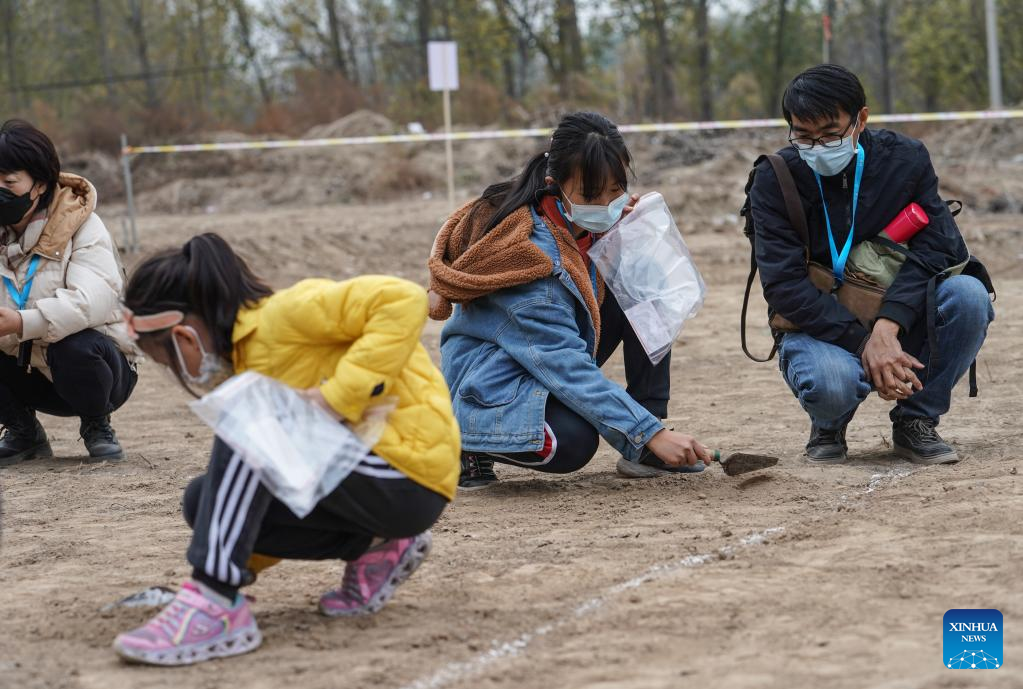 Children practice archaeological excavation work near the Liulihe relic site in Beijing, capital of China, Oct. 30, 2022. Liulihe relic site in Fangshan District of Beijing is believed to be the capital of the Yan kingdom during the Western Zhou Dynasty (1046-771 BC). As part of this year's Beijing Public Archaeology Season, a tour consisting of 20 families is organized to visit the Yan Capital Site Museum of Western Zhou Dynasty and Liulihe relic site on Sunday. (Xinhua/Chen Zhonghao)