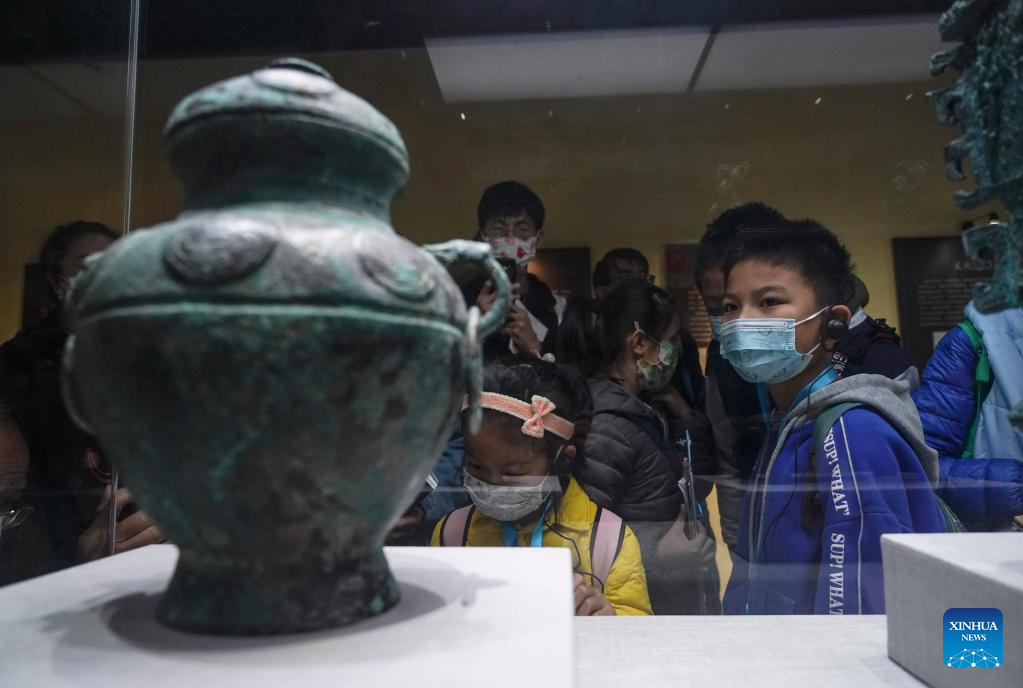Children look at a bronze wine vessel displayed at the Yan Capital Site Museum of Western Zhou Dynasty in Beijing, capital of China, Oct. 30, 2022. Liulihe relic site in Fangshan District of Beijing is believed to be the capital of the Yan kingdom during the Western Zhou Dynasty (1046-771 BC). As part of this year's Beijing Public Archaeology Season, a tour consisting of 20 families is organized to visit the Yan Capital Site Museum of Western Zhou Dynasty and Liulihe relic site on Sunday. (Xinhua/Chen Zhonghao)