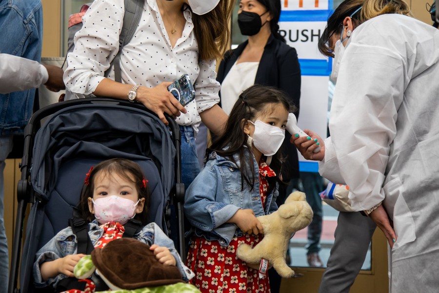 A girl has her temperature measured at a COVID-19 vaccination site in Times Square, New York, the United States, on June 22, 2022. (Photo by Michael Nagle/Xinhua)