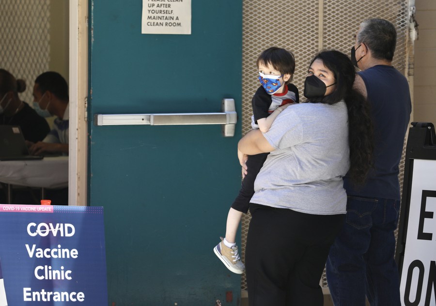 People wearing face masks wait at a COVID-19 vaccine clinic in Los Angeles, California, the United States, on Aug. 5, 2022. (Xinhua)