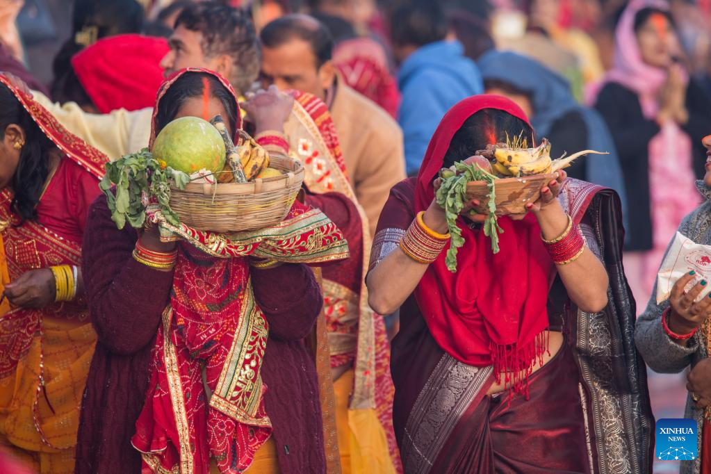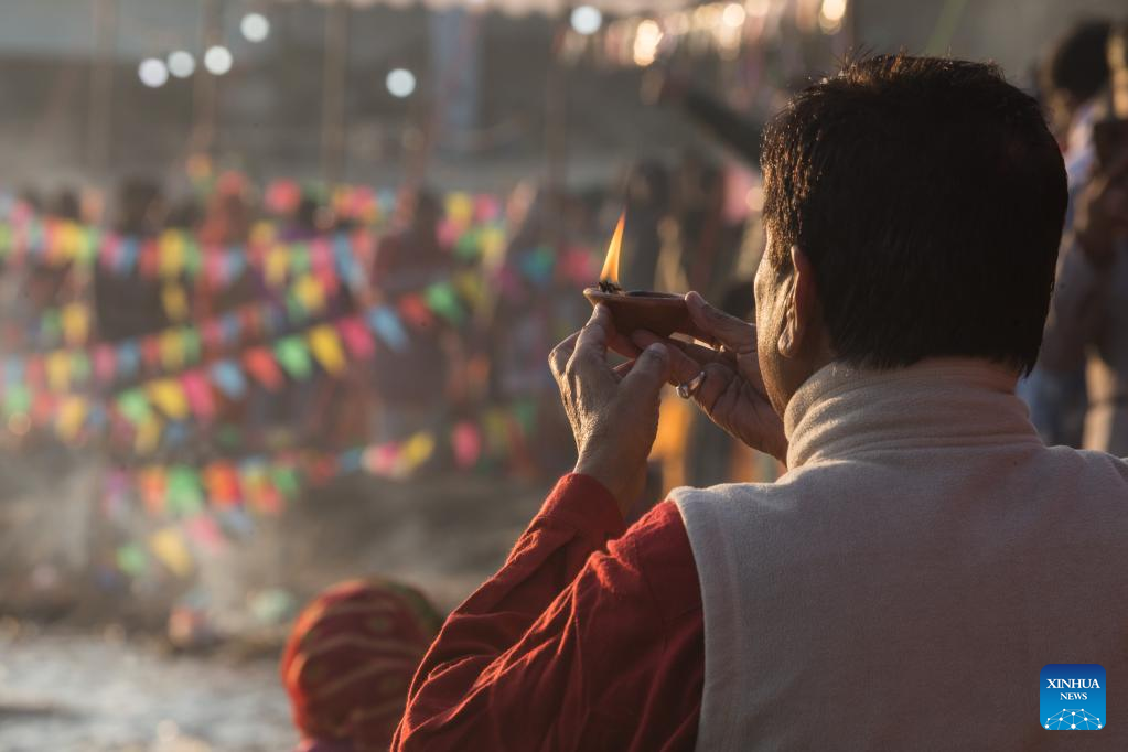 People worship the rising sun during the Chhath festival on the bank of the Bagmati River in Kathmandu, Nepal, Oct. 31, 2022. The Chhath festival is dedicated to the sun, which is regarded as a token of stability and prosperity, and a Vedic goddess "Chhathi Maiya." (Photo by Hari Maharjan/Xinhua)
