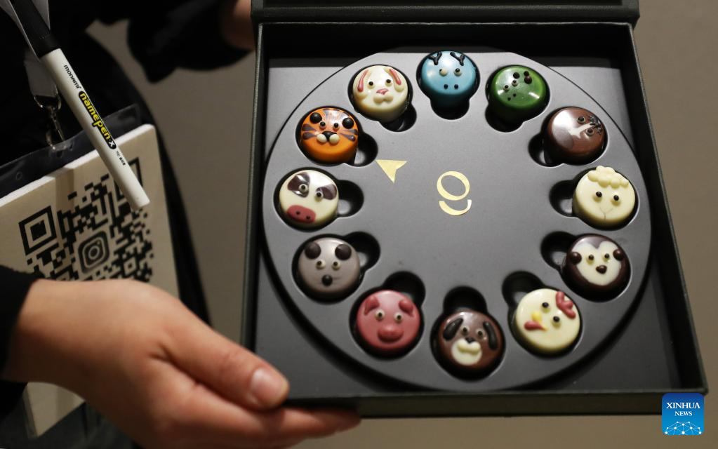 A South Korean chocolatier displays chocolates at the 27th Salon du Chocolat at the Versailles Expo in Paris, France, Oct. 31, 2022. The 27th Salon du Chocolat (chocolate fair) was held from Oct. 28 to Nov. 1. (Xinhua/Gao Jing)