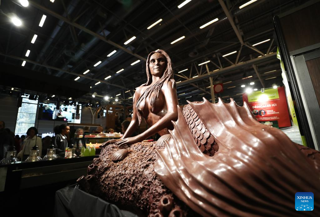 A mermaid sculpture made of chocolate is seen at the 27th Paris Chocolate Fair at the Versailles Expo in Paris, France, Oct. 31, 2022. The 27th Salon du Chocolat (chocolate fair) was held from Oct. 28 to Nov. 1. (Xinhua/Gao Jing)