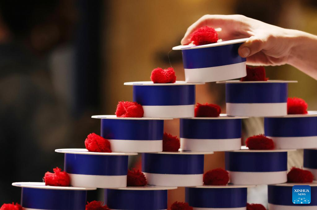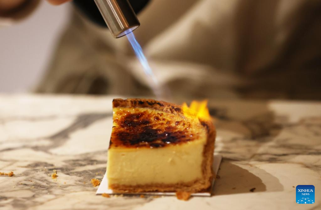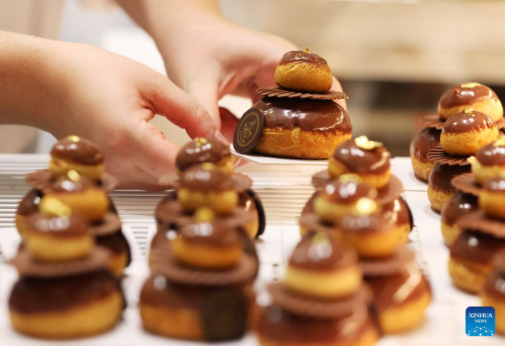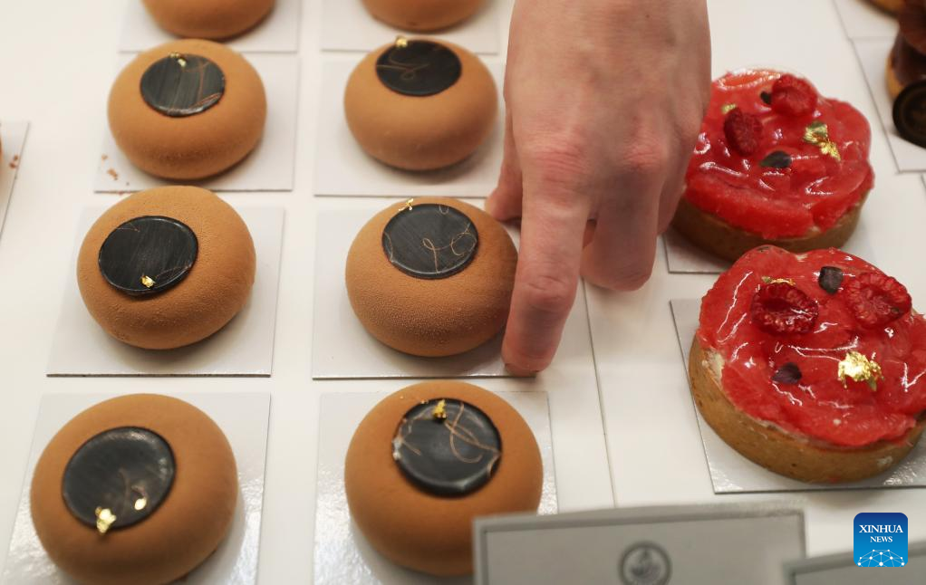 A pastry chef prepares a flan at the 27th Paris Chocolate Fair at the Versailles Expo in Paris, France, Oct. 31, 2022. The 27th Salon du Chocolat (chocolate fair) was held from Oct. 28 to Nov. 1. (Xinhua/Gao Jing)