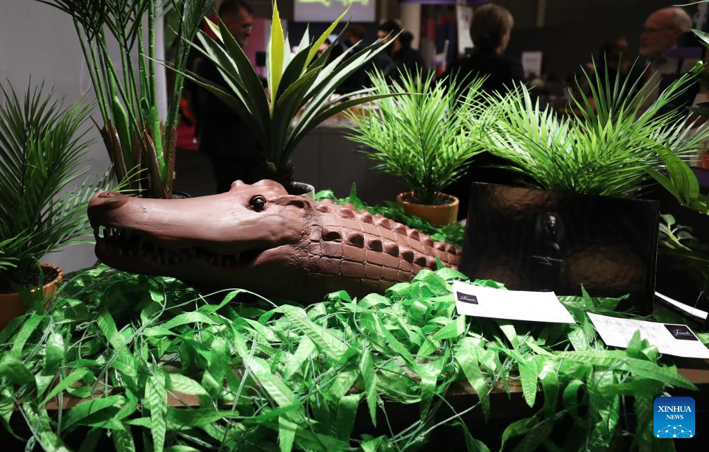 A crocodile sculpture made of chocolate is seen at the 27th Salon du Chocolat at the Versailles Expo in Paris, France, Oct. 31, 2022. The 27th Salon du Chocolat (chocolate fair) was held from Oct. 28 to Nov. 1. (Xinhua/Gao Jing)