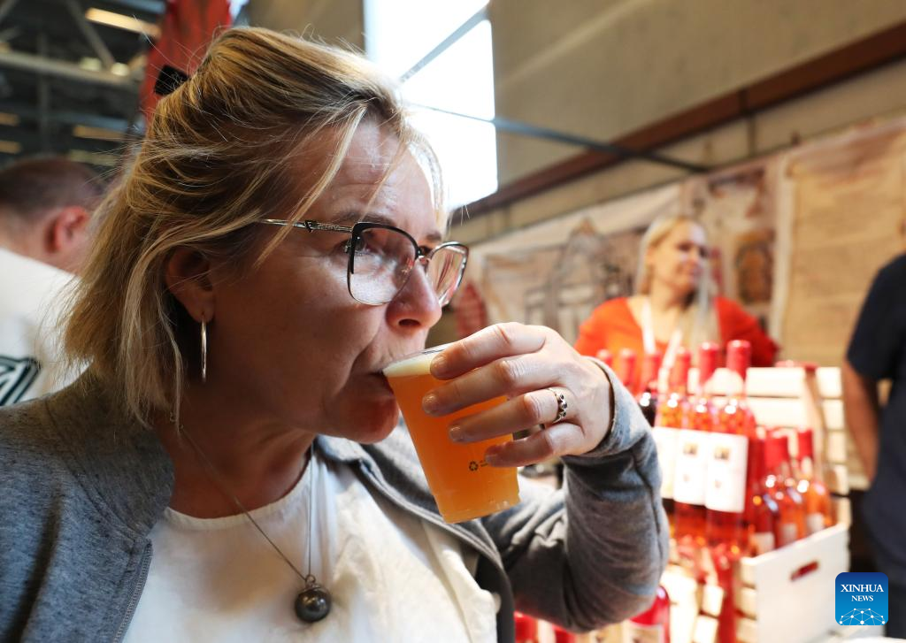 A woman enjoys chocolate beer at the 27th Salon du Chocolat at the Versailles Expo in Paris, France, Oct. 31, 2022. The 27th Salon du Chocolat (chocolate fair) was held from Oct. 28 to Nov. 1. (Xinhua/Gao Jing)
