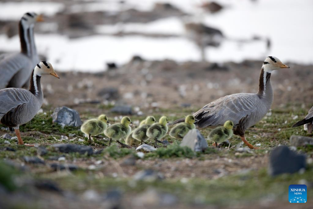 This photo taken on June 2, 2020 shows bar-headed geese at the Bird Island wetland at Qinghai Lake in northwest China's Qinghai Province. Qinghai Lake, located in northwest China's Qinghai Province, is China's largest inland saltwater lake. It is a major transit point for migratory birds from Central Asia to India and East Asia to Australia. It also serves as an important winter home for waterbirds on the Qinghai-Tibet Plateau.