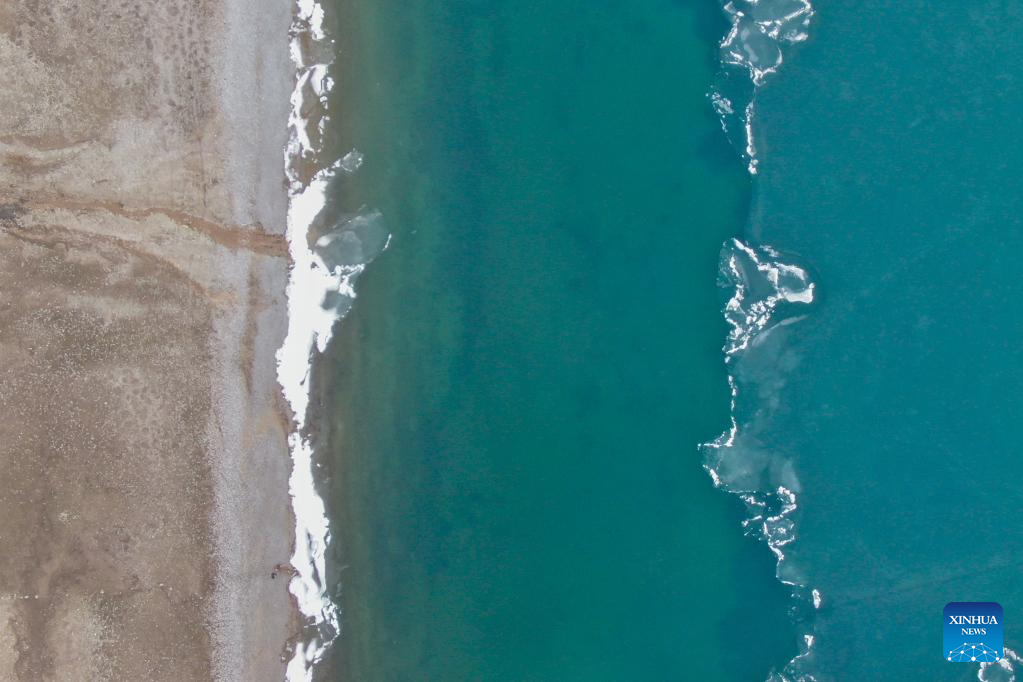 This aerial photo taken on April 20, 2020 shows a view of Qinghai Lake at Heimahe Town, Gonghe County of northwest China's Qinghai Province.