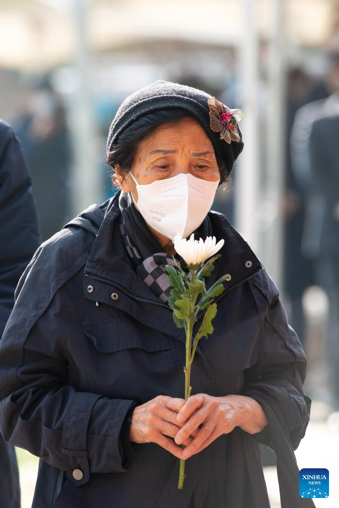 People holding flowers walk to a mourning altar set up at Seoul Plaza in Seoul, South Korea, Nov. 1, 2022. The death toll from a crowd crush, which occurred Saturday night at the Itaewon district of the South Korean capital Seoul during Halloween gatherings, rose overnight, the authorities said Tuesday. At least 156 people were killed and 151 others injured in the incident, according to the Ministry of the Interior and Safety. The government has announced a one-week national mourning period over the tragedy until Nov. 5. (Xinhua/Wang Yiliang)