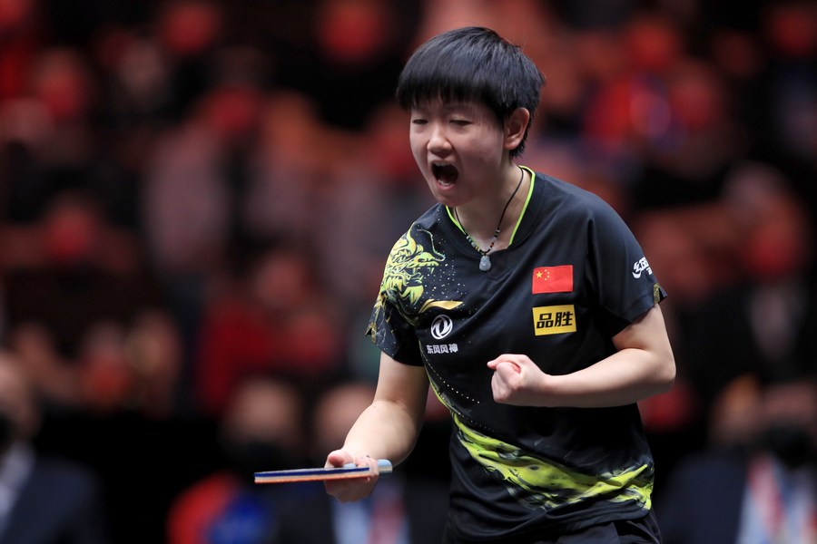 Sun Yingsha of China celebrates scoring during the women's singles final match against her teammate Chen Meng at the WTT Cup Finals. (Photo by Gao Zhiyong/Xinhua)