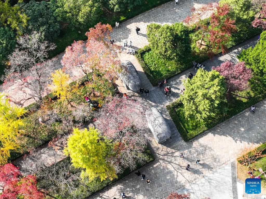This aerial photo taken on Nov. 1, 2022 shows people visiting the imperial Xiaoling Mausoleum, the burial site of the Ming Dynasty's (1368-1644) founding emperor Zhu Yuanzhang, in Nanjing, east China's Jiangsu Province. (Xinhua/Ji Chunpeng)