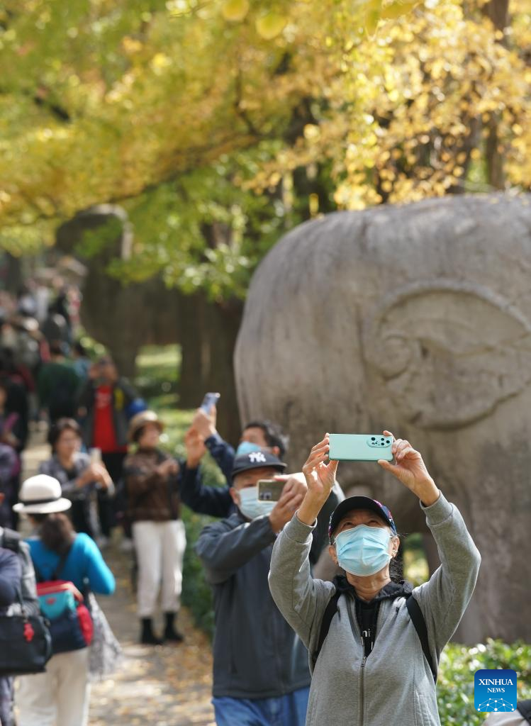 People visit the imperial Xiaoling Mausoleum, the burial site of the Ming Dynasty's (1368-1644) founding emperor Zhu Yuanzhang, in Nanjing, east China's Jiangsu Province, Nov. 1, 2022. (Xinhua/Ji Chunpeng)