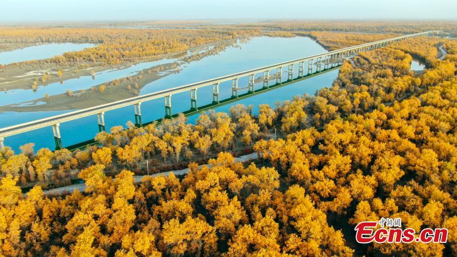 Stunning autumn scenery of desert poplar trees, also known as populus euphratica, along the Tarim River in Xayar County, northwest China's Xinjiang Uyghur Autonomous Region. Covering an area of nearly 313,333 hectares, the golden populus euphratica forest in Xayar County brings vitality to the arid desert. (Photo: China News Service/Liu Yuzhu)