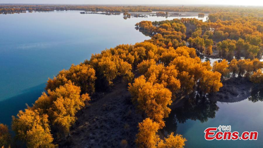 Stunning autumn scenery of desert poplar trees, also known as populus euphratica, along the Tarim River in Xayar County, northwest China's Xinjiang Uyghur Autonomous Region. Covering an area of nearly 313,333 hectares, the golden populus euphratica forest in Xayar County brings vitality to the arid desert. (Photo: China News Service/Liu Yuzhu)