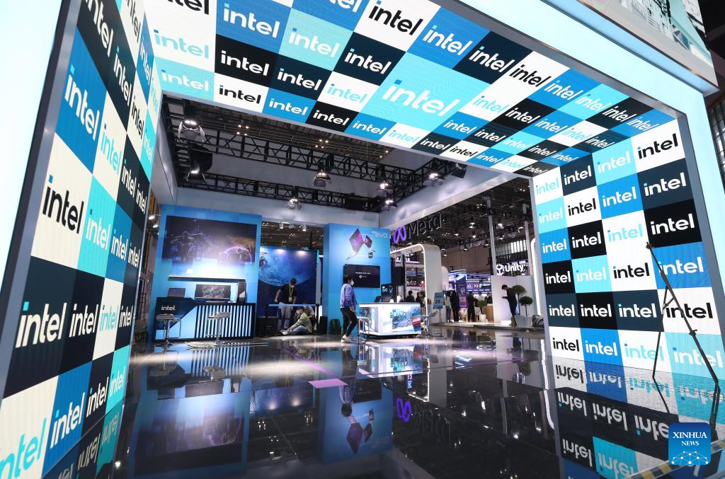 Workers set up the exhibition booth of Intel Corporation in preparation for the upcoming fifth China International Import Expo (CIIE) in east China's Shanghai, Nov. 2, 2022.