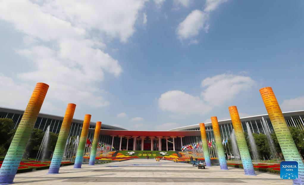 This photo taken on Nov. 2, 2022 shows the south square of the National Exhibition and Convention Center (Shanghai), the main venue for the upcoming fifth China International Import Expo (CIIE), in east China's Shanghai. Preparations for the CIIE, which will be held in Shanghai from Nov. 5 to 10, have entered the final stage. (Xinhua/Fang Zhe)