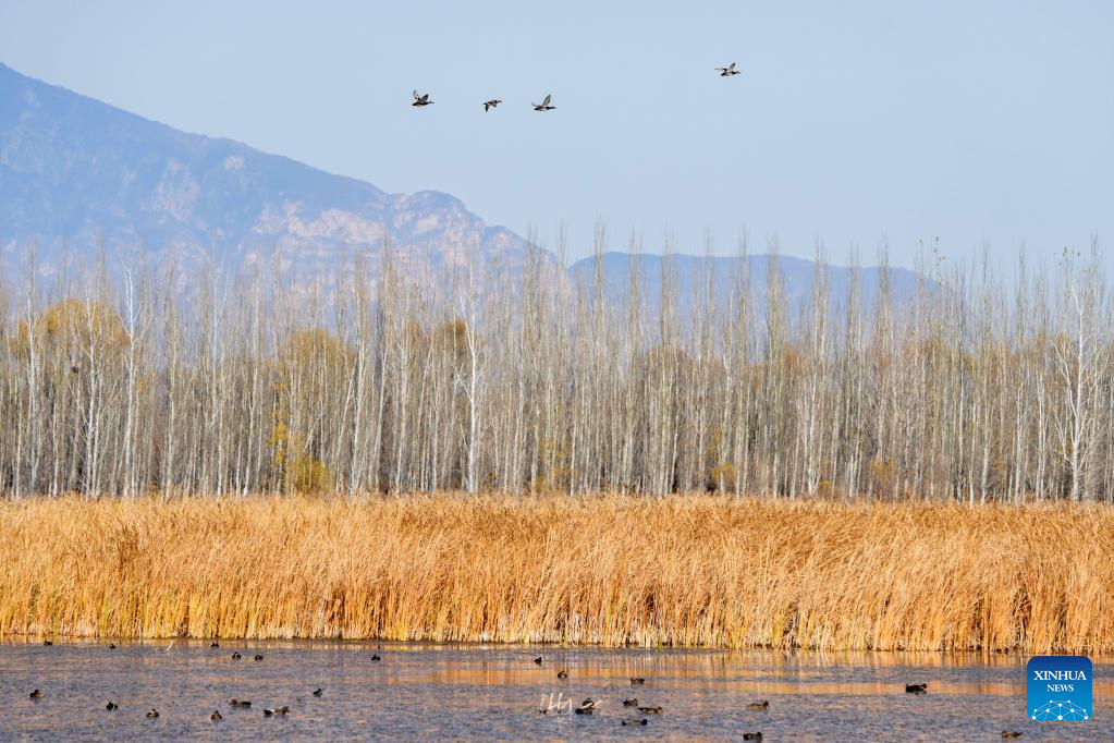 This photo taken on Nov. 1, 2022 shows the view of Yeya (Wild Duck) Lake national wetland park in Yanqing District of Beijing, capital of China. Yeya Lake Wetland Reserve became Beijing's first wetland conservation area in 1997. It functions as an ecological shield for Beijing, protecting the city's water source and providing a habitat for wild animals. (Xinhua/Ju Huanzong)