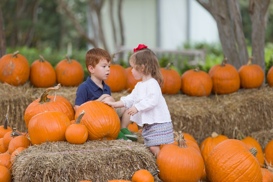 Children are seen among pumpkins at Arboretum's Pumpkin Village in Dallas, Texas, the United States, Sept. 28, 2021. (Photo by Tian Dan/Xinhua)